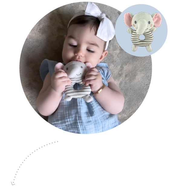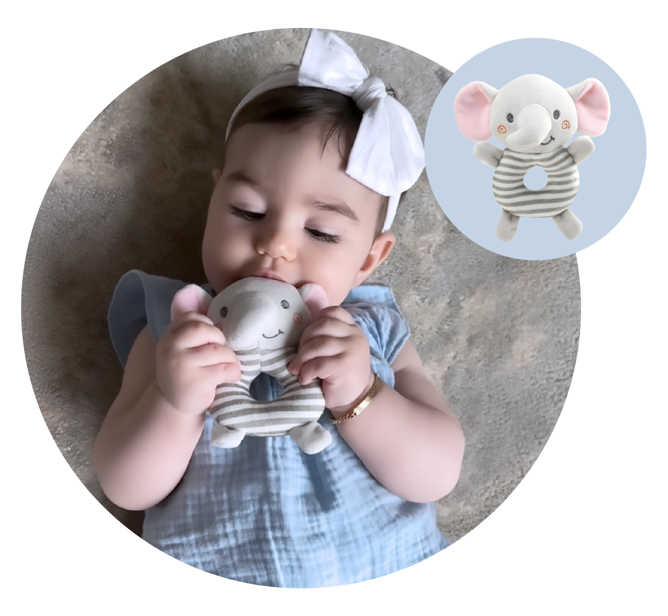 Estimula el sentido del oído, el tacto y la motricidad fina con su textura suave, sonido de celofán y cascabel. Su forma y diseño de elefante fomentan el agarre, la exploración y la curiosidad, brindando seguridad y diversión.