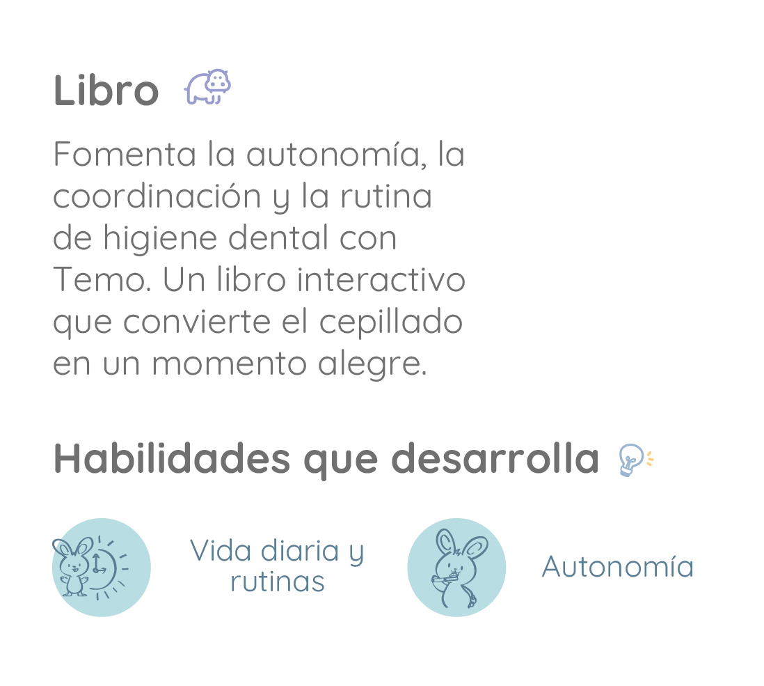 Fomenta la autonomía, la coordinación y la rutina de higiene dental con Temo. Un libro interactivo que convierte el cepillado en un momento alegre.