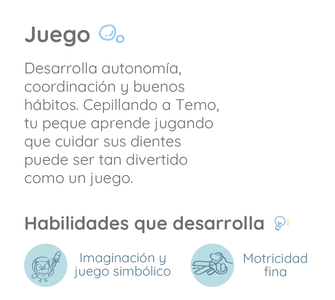 Desarrolla autonomía, coordinación y buenos hábitos. Cepillando a Temo, tu peque aprende jugando que cuidar sus dientes puede ser tan divertido como un juego.